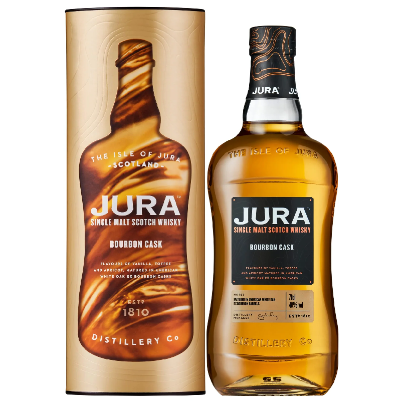 Chaque bouteille de Jura Bourbon Cask Single Malt Scotch Whisky incarne l'esprit et l'histoire de cette région unique, offrant des arômes riches et complexes qui se dévoilent à chaque dégustation. Les fûts de bourbon utilisés pour le vieillissement apportent des notes douces de vanille, de caramel et une subtile touche boisée, conférant à ce whisky un équilibre parfait. Ce single malt se distingue par sa texture onctueuse et son caractère distinctif, marqué par des arômes de fruits secs, de miel et une légère fumée qui rappellent l'atmosphère maritime de l'île de Jura.
